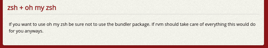 하지만.. 여기시 한가지 작은 문제가 발생하는데 zsh을 이용할 경우 zsh 설치과정를 통해 설정을 해야되는데 이게 어려울 뿐만 아니라 거의 모든 zsh 유저가 사용하는 oh-my-zsh를 이용할 경우 공식페이지에서 직접 rvm를 안쓰는걸 추천한다고 하니..